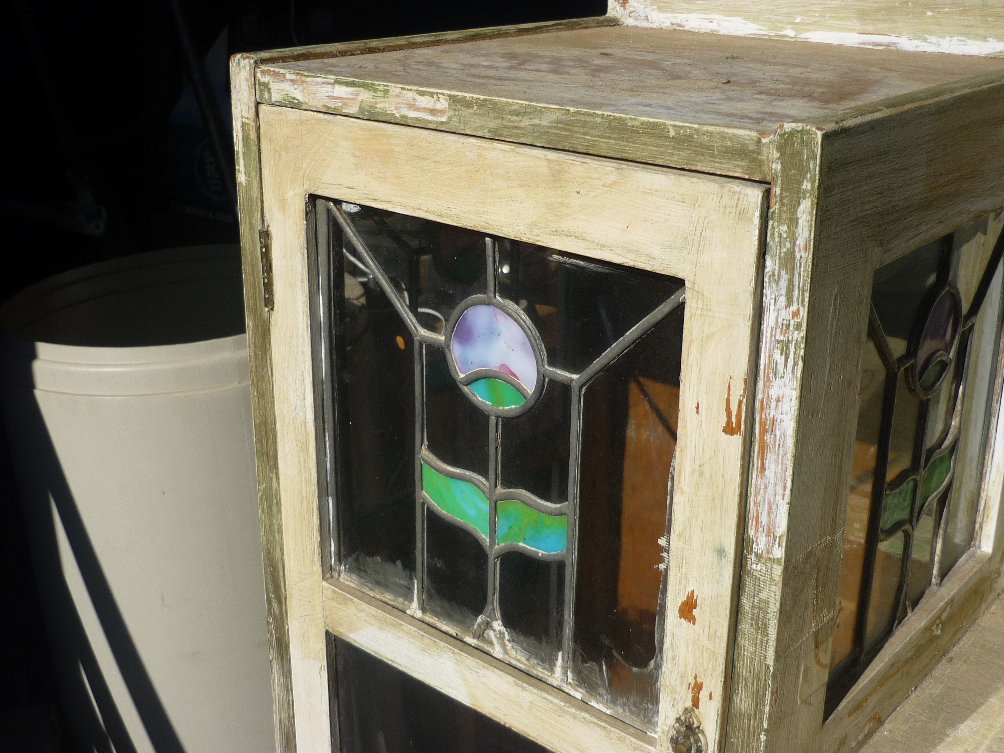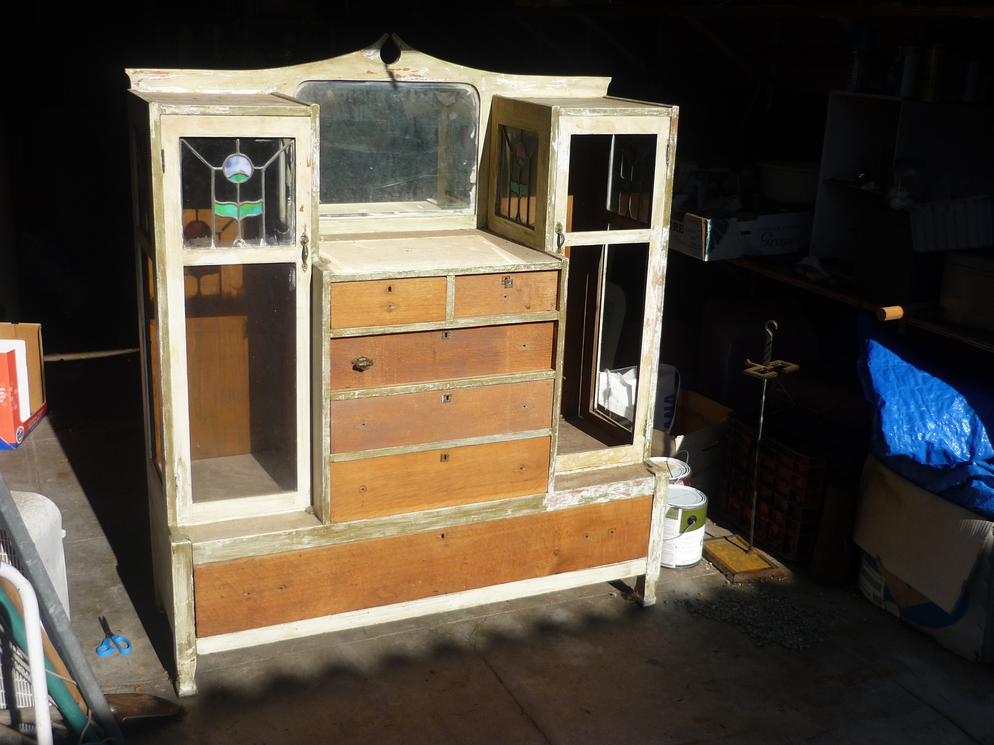 I have been gifted an old bureau. Well, we will see if it really is a blessing or a curse. At this point, I see the potential. The wood is oak. My plan for refurbishing involves the three S’s: Stripping, Sanding and Staining. Plus I have a feeling along the road that other not so holy ‘S’ word will be finding its way into my vocabulary. This bureau has a lot of potential. I have a great guy that can redo all the glass work. Matter of fact, had a visit with him this last Saturday. With the possibility of replacing the clear glass with German antique glass. Are your eyes starting to cross? I thought so. It will be a process and thus the tale begins…
