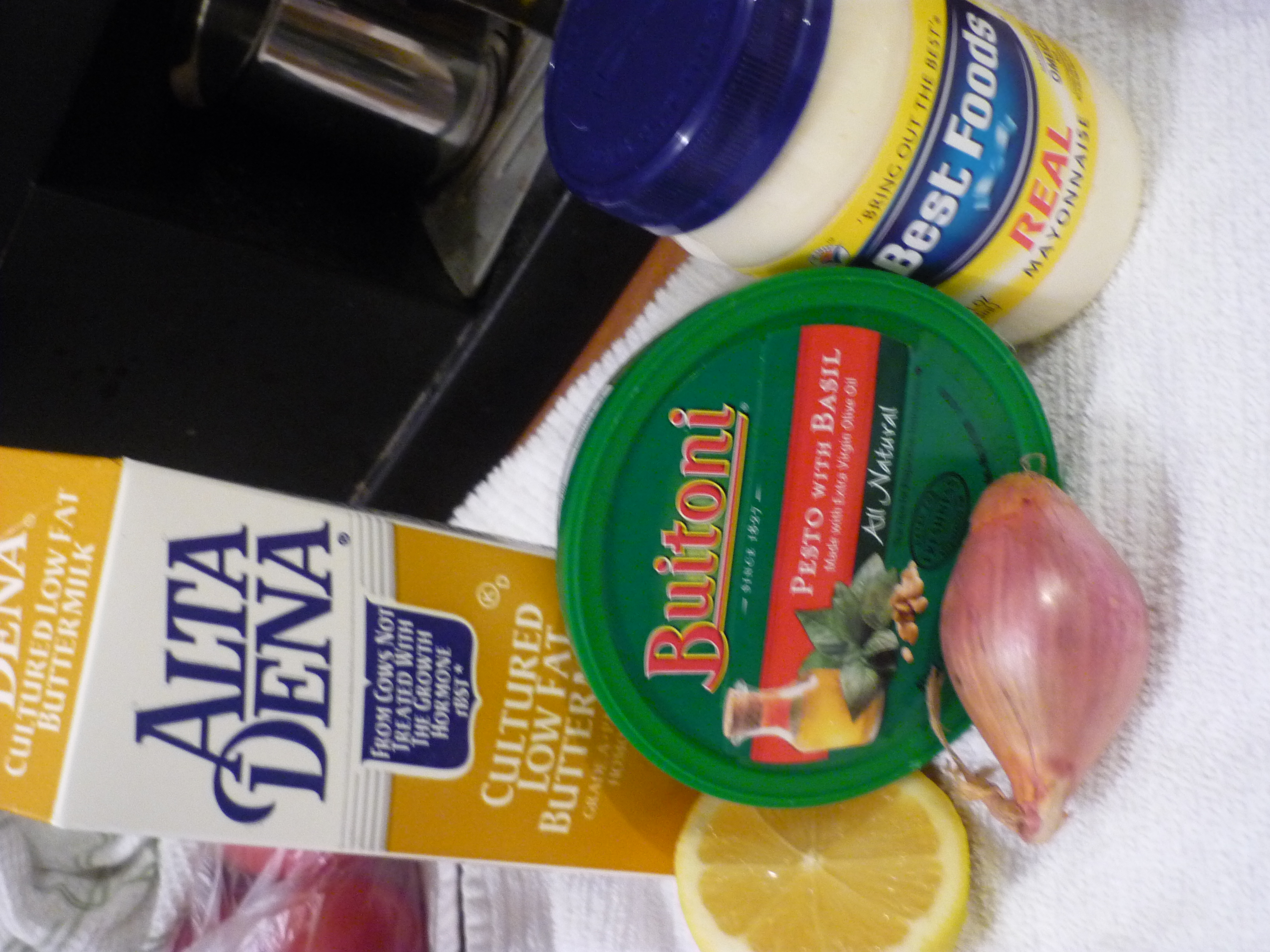 Add first three ingredients to food processor and blend thoroughly. With motor running, pour in buttermilk. Add remaining ingredients to combine. If using prepared pesto (you can find it in the refrigerated section by cheeses), taste before adding additional salt. Store in refrigerator.