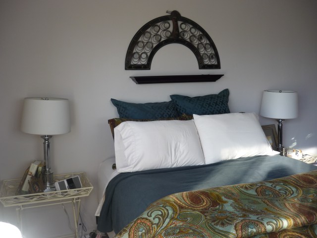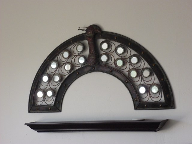 I don’t have a headboard so I substituted a peacock mirror and a shelf unit as the pseudo headboard.
