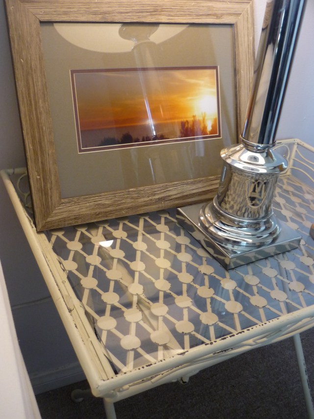 And I don’t have normal nightstands. So I bought matching foldable tables at Ross. Then I bought sheets of plastic polycarbonate at Home Depot and cut them down to size to fit on top.