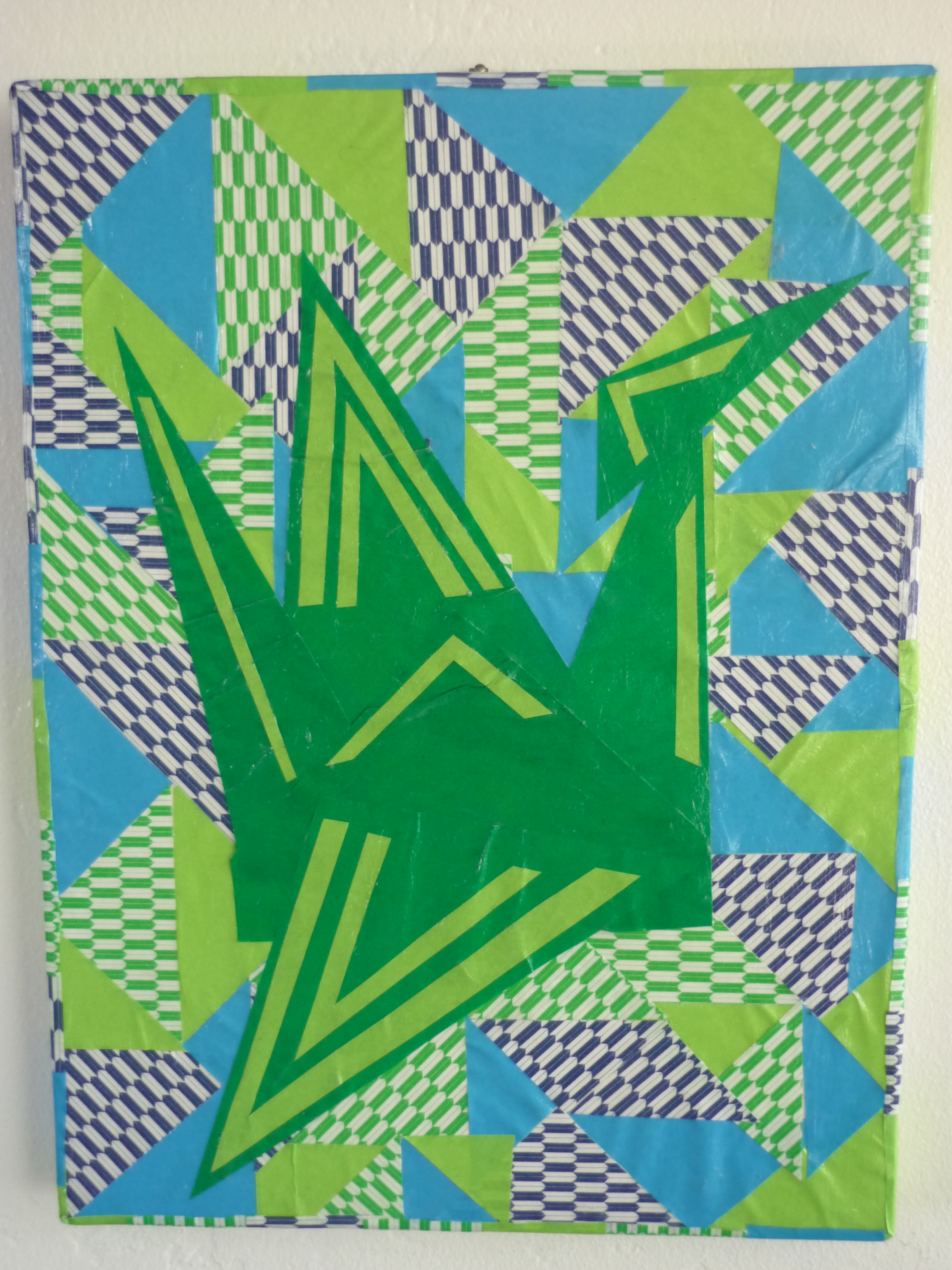 I used white paper to make a paper crane pattern. I copied the pattern onto green paper, arranged it on the canvas and glued.