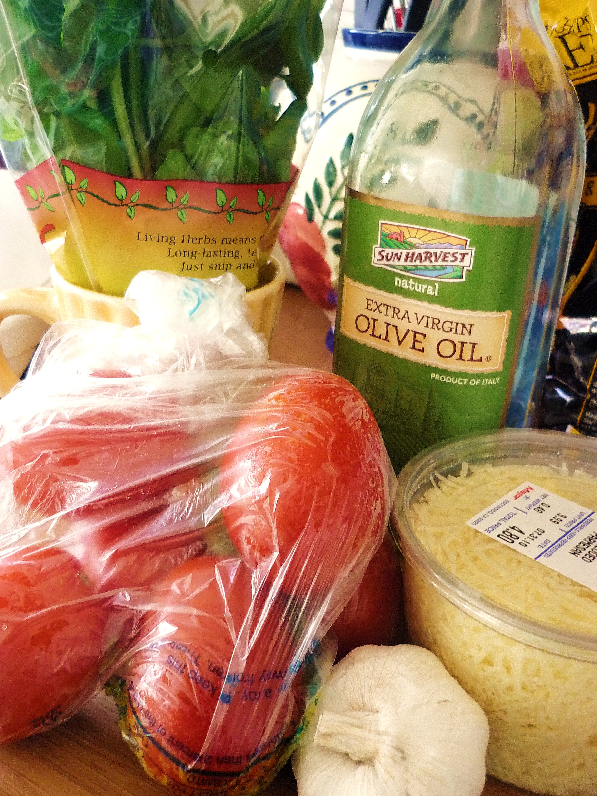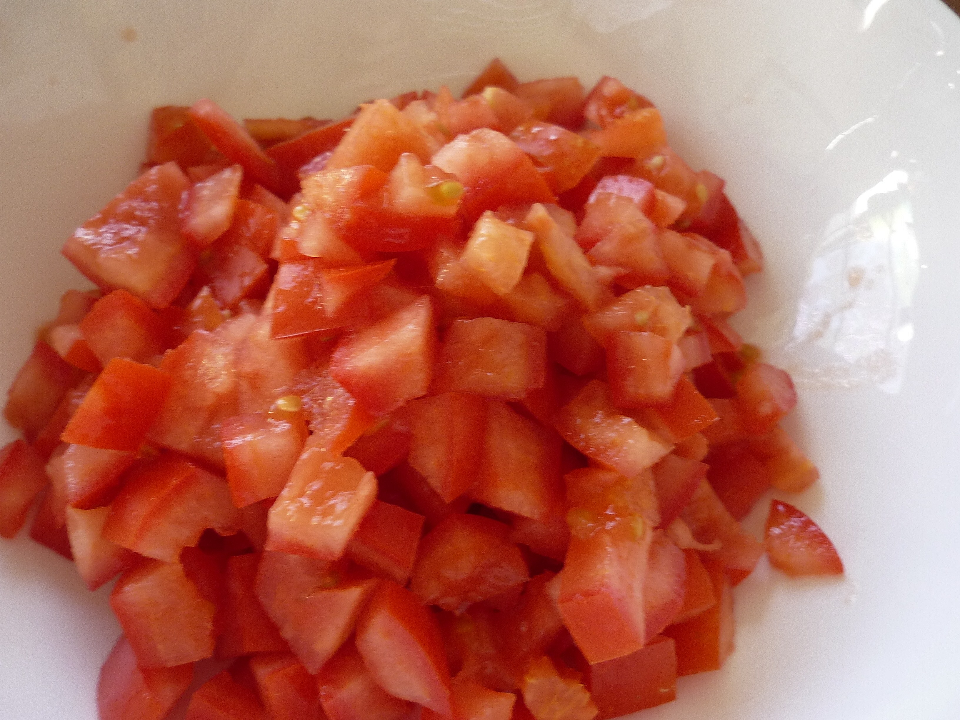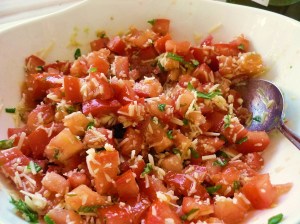 Chop up tomatoes, garlic and basil. Put all three ingredients in a bowl, add parmesan cheese, olive oil, a dash of salt and black pepper.